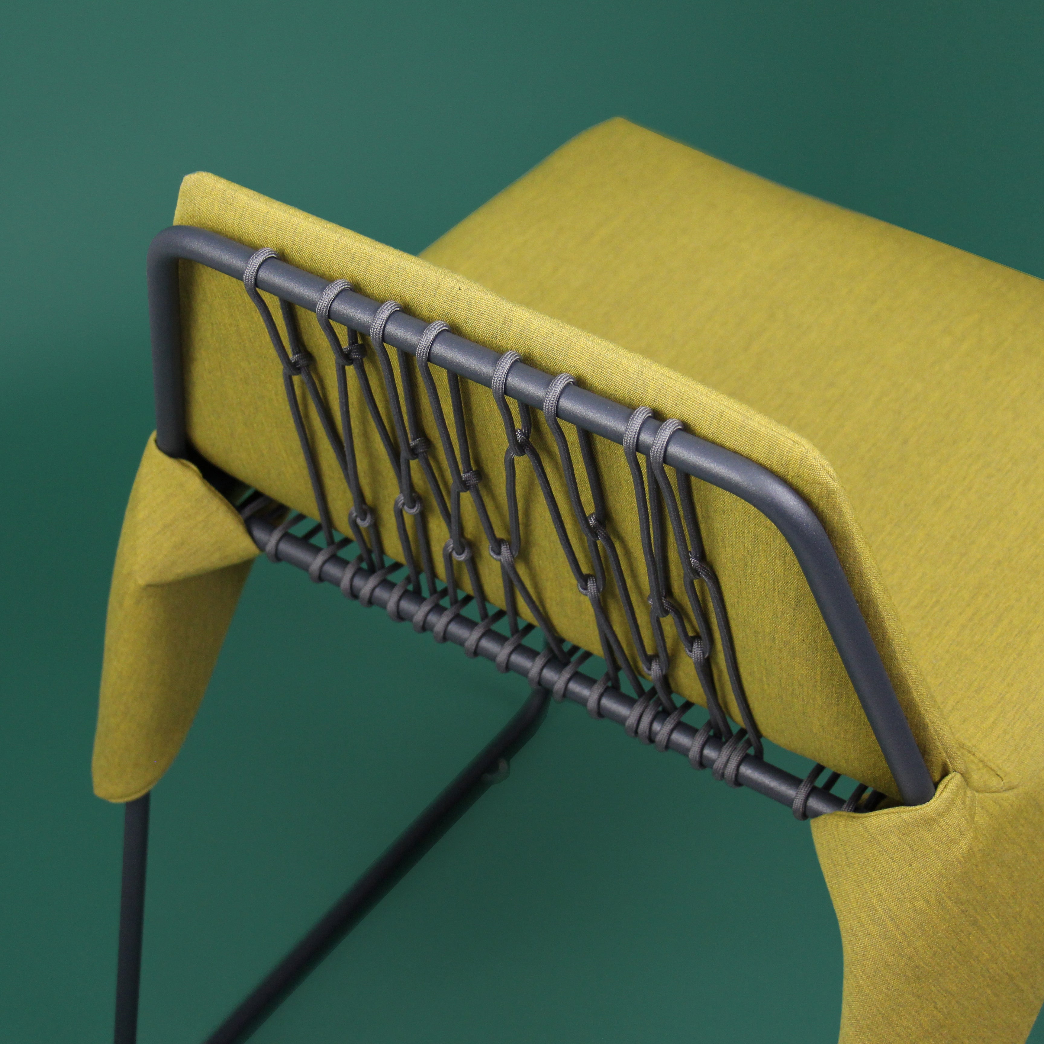 The Merkled Net Wrap Chair features a minimal welded steel frame wrapped with knotted nylon cord and an upholstered removable cushion made from durable outdoor Sunbrella fabric, creating a flexible and comfortable seat.